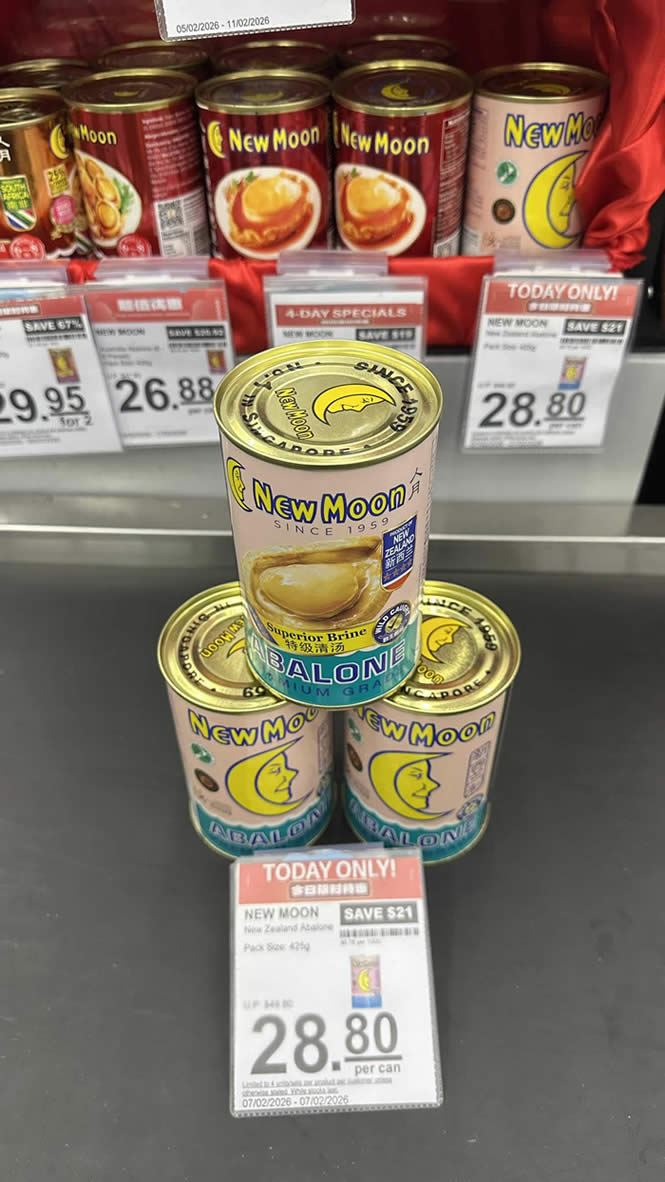 - New Moon Premium Wild Caught New Zealand Abalone 425g – Usual Price: $49.80 | Save $21.00 (42%) | Offer: $28.80 per can