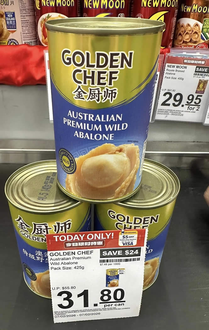 - Golden Chef Australian Premium Wild Abalone 425g – Usual Price: $55.80 | Save $24.00 (43%) | Offer: $31.80 per can
