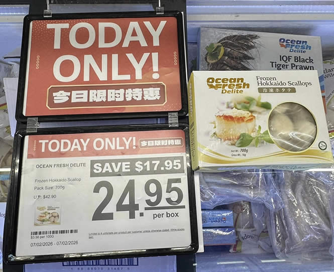 - Ocean Fresh Delite Frozen Hokkaido Scallops 700g – Usual Price: $42.90 | Save $17.95 (41%) | Offer: $24.95 per box π¦ͺ