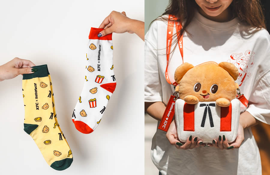 From left to right: KFC x Butterbear Long Socks, KFC x Butterbear Plush Crossbody Bag