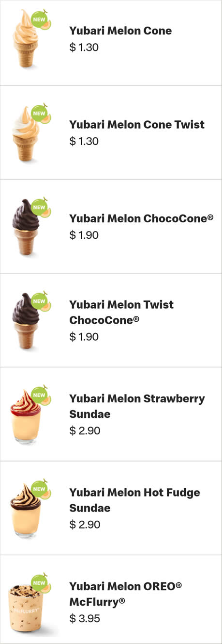 - Yubari Melon Strawberry Sundae and Yubari Melon Hot Fudge Sundae are $2.90 each