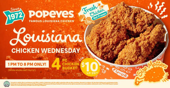 Popeyes S’pore selling 4pcs chicken for $10 on Wednesdays, 1pm-8pm http://singpromos.com/dining-restaurants-food/popeyes-spore-selling-4pcs-chicken-for-10-on-wednesdays-1pm-8pm-298619/ http://singpromos.com/dining-restaurants-food/popeyes-spore-selling-4pcs-chicken-for-10-on-wednesdays-1pm-8pm-298619/#respond Mon, 26 Jan 2026 10:15:44 +0000 https://singpromos.com/?p=298619