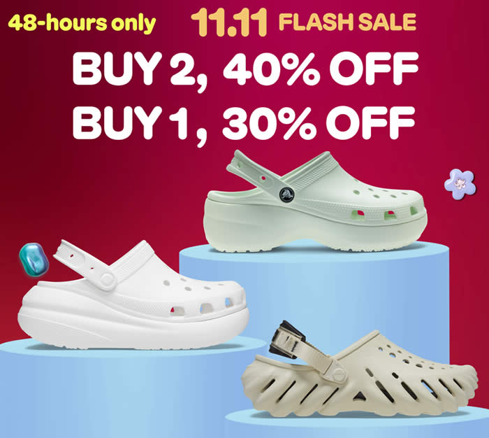 Crocs Singapore is running an irresistible 48-hour Flash Sale from 11 to 12 November 2025. Shoppers can enjoy 40% off when they buy 2 pairs, or 30% off when they buy 1 pair – perfect for upgrading your footwear or gifting a stylish pair this festive season.