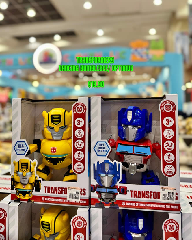 Animated Bumblebee and Optimus Prime toys featuring lights and sound.