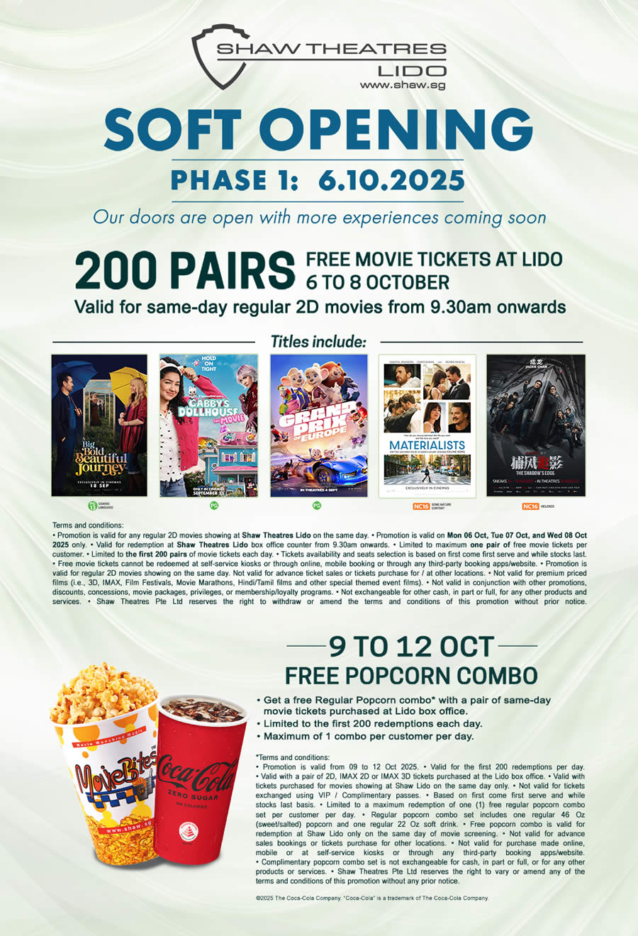 On top of the ticket giveaway, from 9 to 12 October 2025, customers who purchase a pair of same-day tickets at Lido can redeem a free Regular Popcorn Combo (includes popcorn and a Coca-Cola drink). Limited to the first 200 redemptions per day, maximum 1 combo per customer.