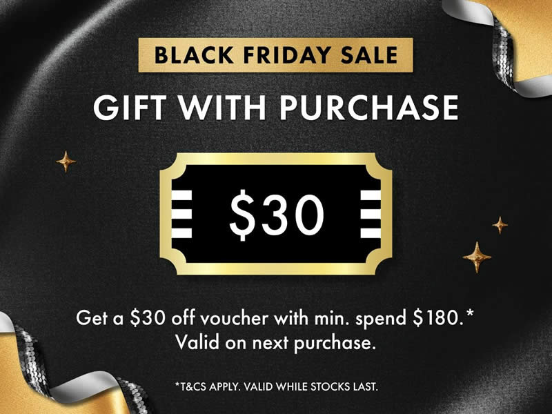 Spend a minimum of $180 during the Black Friday period to receive a $30 bounce-back voucher, valid on your next purchase. Do note that a minimum spend of $180 is also required when you redeem this voucher, so plan your cart to maximise the savings.