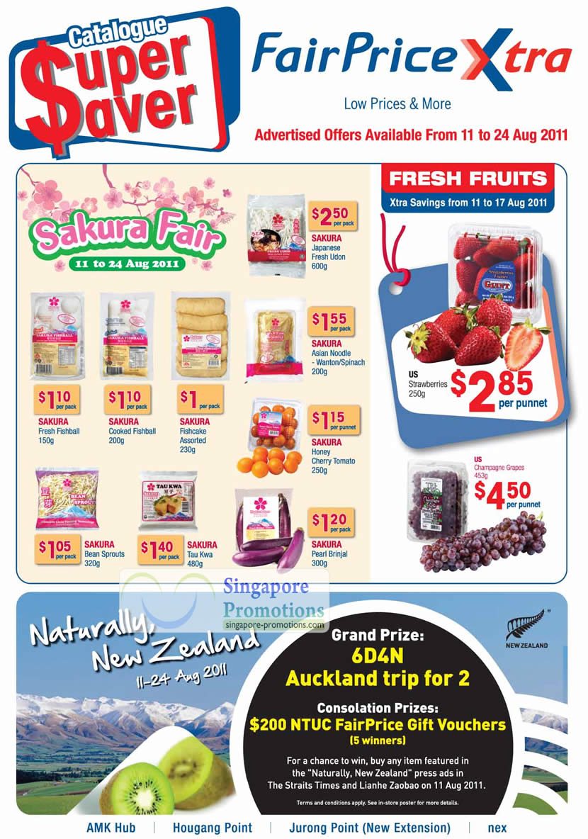 FairPrice Groceries, Baby, Bedding, Electronics & Kitchenware Special Offers 11 - 24 Aug 2011 Sakura Fair, Fresh Fruits, Udon, Asian Noodle Wanton Spinach, Bean Sprouts, Pearl Brinjal, US Champagne Grapes