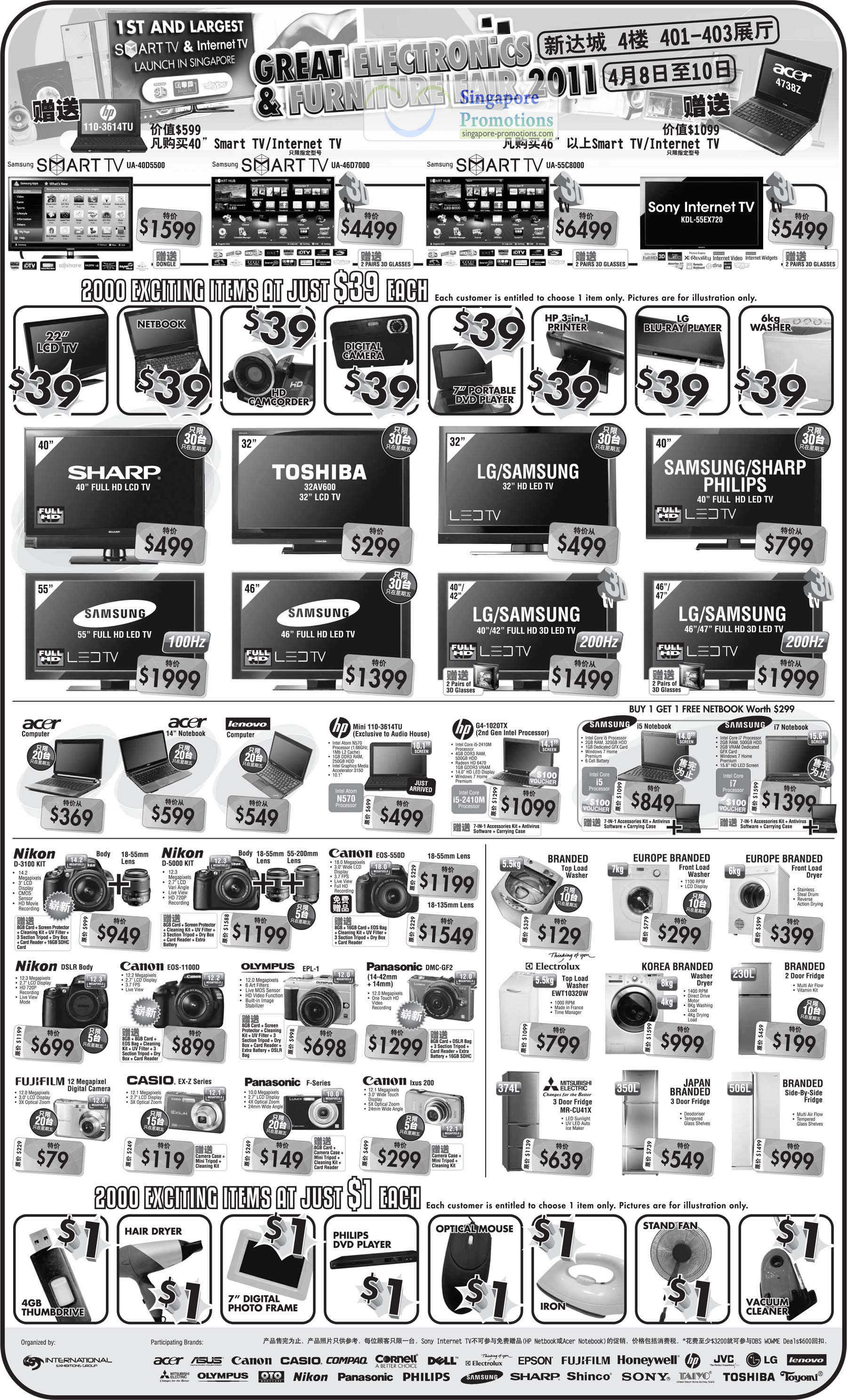 Great Electronics & Furniture Fair 2011 8 - 10 Apr 2011 8 Apr Samsung Smart TV UA 40D5500 46D7000 55C8000 KDL 55EX720 D3100 D5000 EOS 550D EOS 1100D Olympus EPS-1 DMC-GF2 Ixus 200
