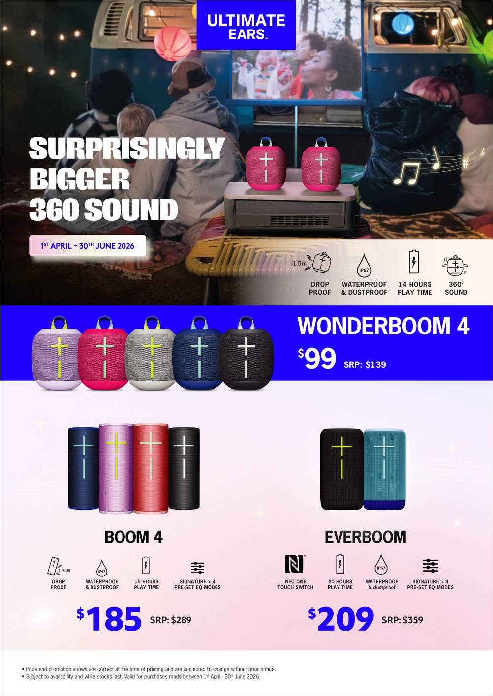 🔊 Useful highlights from the Ultimate Ears visual include WONDERBOOM 4 with 1.5m drop protection, IP67 waterproof and dustproof rating, up to 14 hours of play time and 360° sound; BOOM 4 with IP67 protection, up to 15 hours of play time and Signature + 4 pre-set EQ modes; and EVERBOOM with NFC One Touch Switch, IP67 protection, up to 20 hours of play time and Signature + 4 pre-set EQ modes.