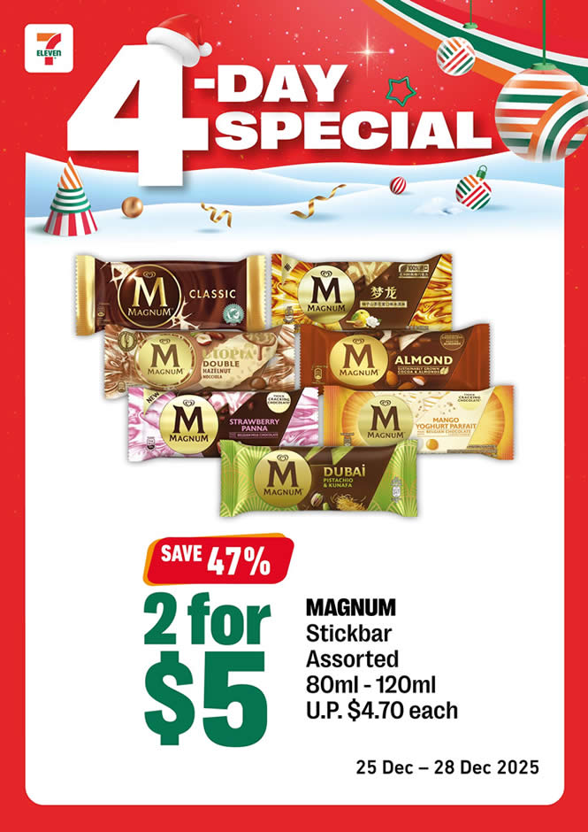 With premium Magnum ice cream leading the way, this 7-Eleven 4-Day Special is a must-check for anyone looking to stretch their festive dollar further. Whether you’re cooling off with ice cream, snacking on chestnuts, or gifting chocolates, these short-term deals make Christmas week that little bit sweeter.