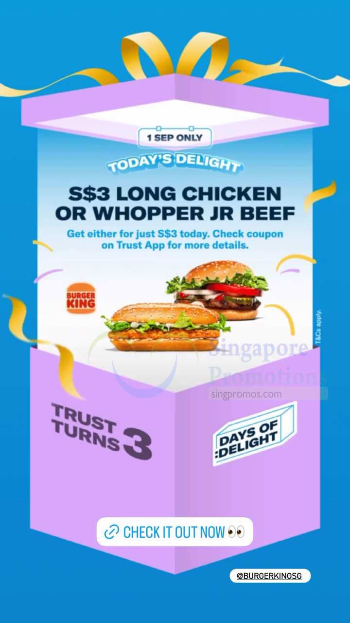 Burger King Singapore is teaming up with Trust Bank to bring a one-day-only delight on 1 September 2025. Grab your choice of a Long Chicken Burger or a Whopper Jr. Beef Burger for just S$3 with no minimum spend.