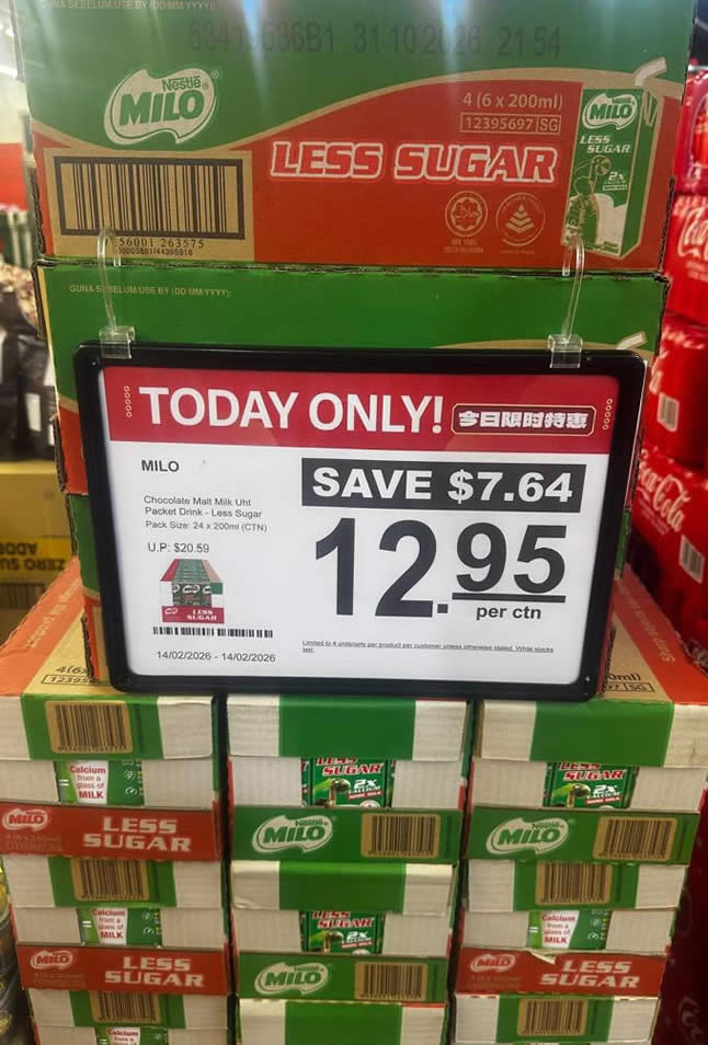 - MILO Activ-Go UHT Multipack Less Sugar 4 x 6s x 200ml – $12.95 per ctn (U.P. $20.59) | Save $7.64 (37%)