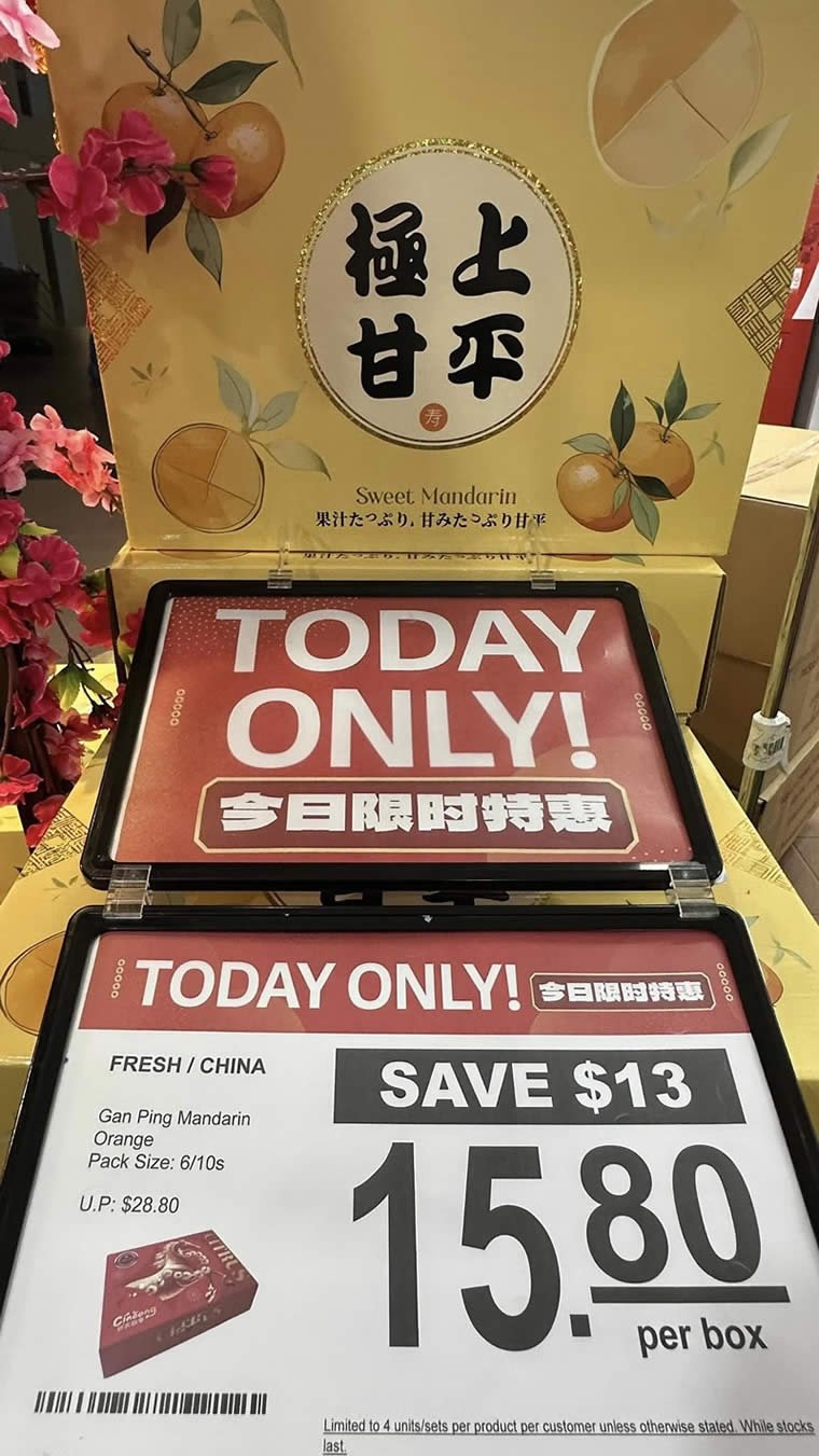- Fresh/China Gan Ping Mandarin Orange 6/10s – $15.80 per box (U.P. $28.80) | Save $13 (45%)