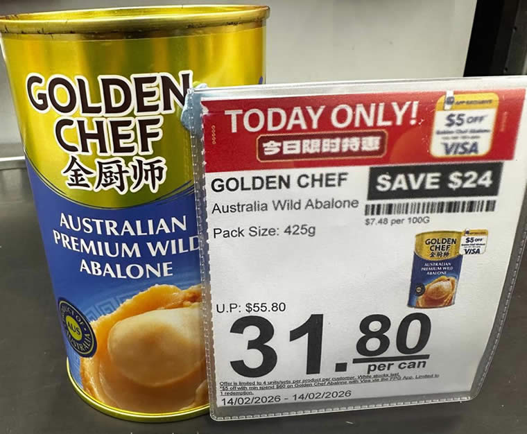 - GOLDEN CHEF Australian Premium Wild Abalone 425g – $31.80 per can (U.P. $55.80) | Save $24 (43%)