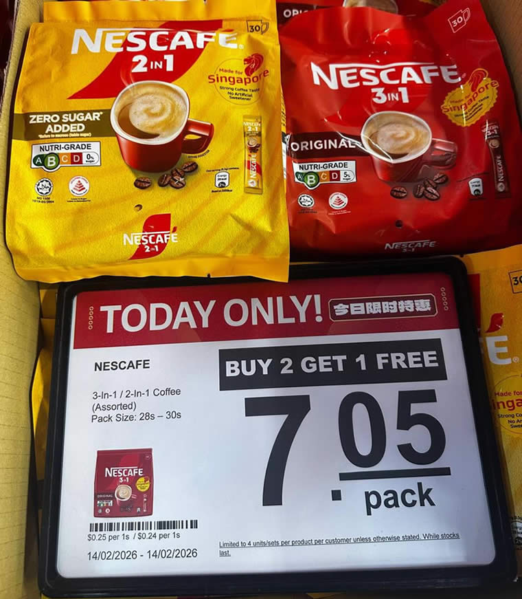 - NESCAFÉ 3-in-1/2-in-1 Coffee Assorted 28s – 30s – $7.05 per pack (Buy 2 Get 1 Free)