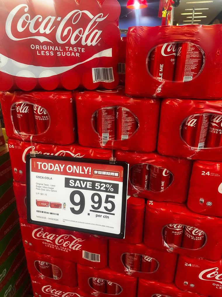 - Coca-Cola Original Taste / Less Sugar / Zero Sugar 24s x 320ml – $9.95 per carton (U.P. $21.15) | Save $11.20