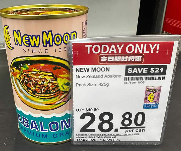 - New Moon Wild Caught New Zealand Abalone 425g – $28.80 per can (U.P. $49.80) | Save $21 (42%)