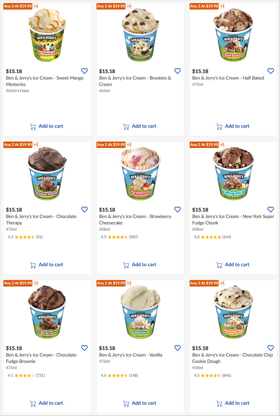 - Ben & Jerry’s Ice Cream Pints (427ml – 473ml): 2 for $19.90