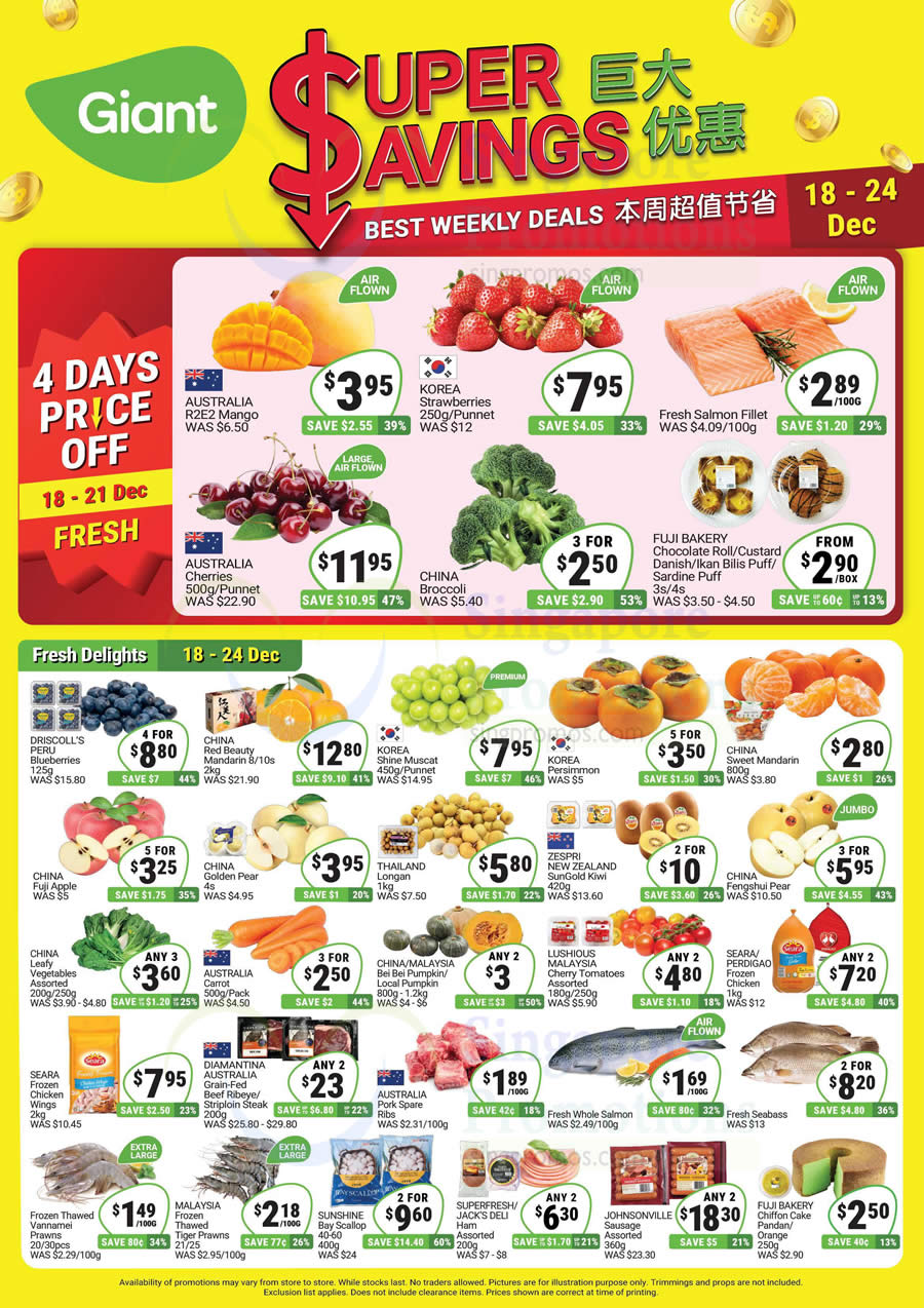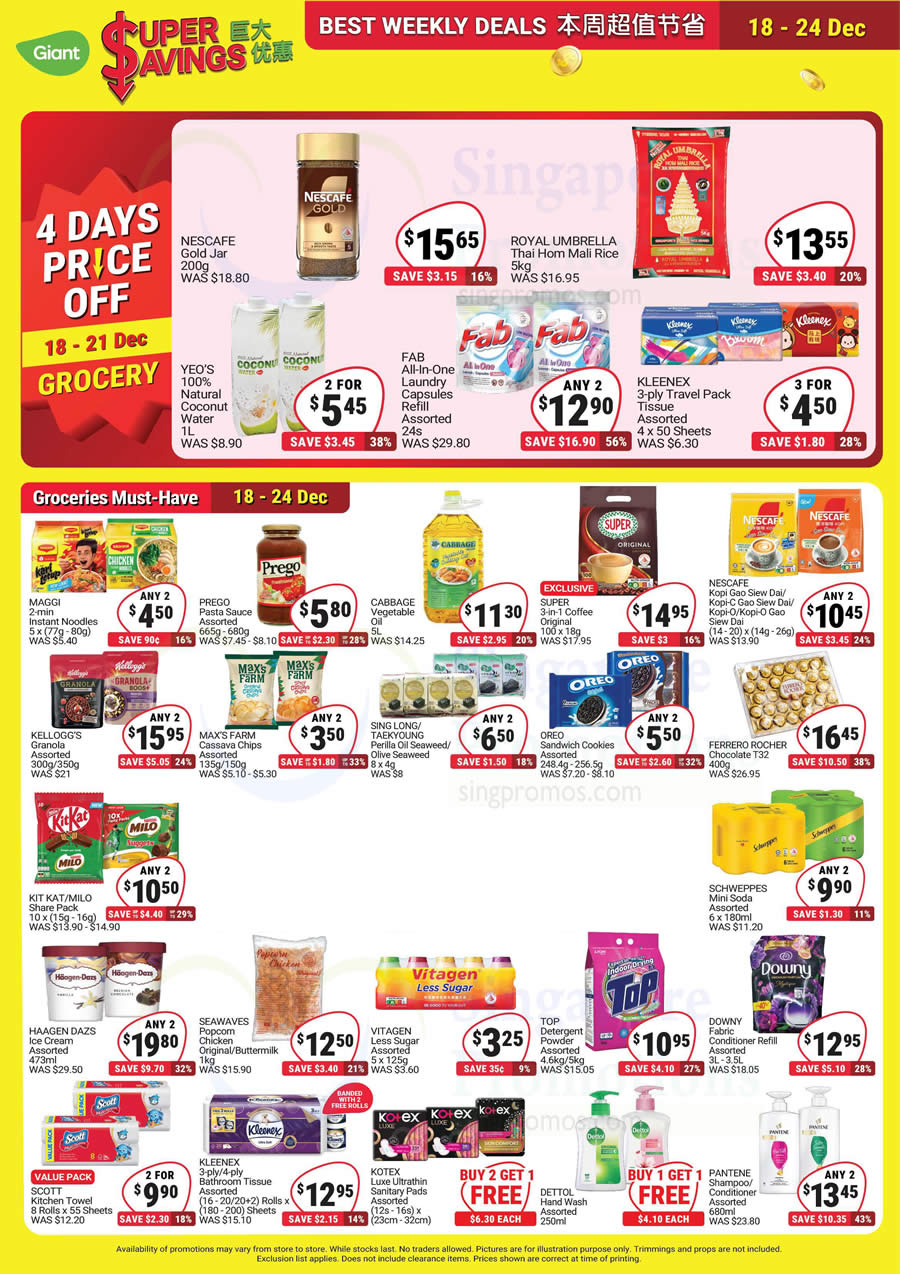 Until 24 Dec 2025, Giant Singapore is running its Super Savings Weekly Deals, featuring BEST WEEKLY DEALS 18 – 24 Dec and a separate 4 Days Price Off (18 – 21 Dec) for selected items. The flyer shows savings of up to 56% on selected essentials. Stock levels and offers may vary by store, so shoppers who want the best picks are advised to swing by earlier rather than later.