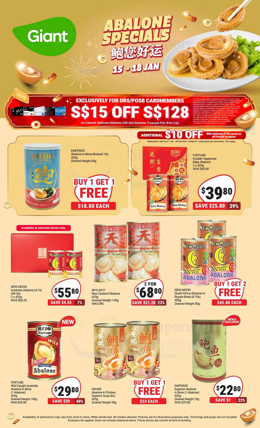 DBS/POSB cardmembers can enjoy S$15 OFF with a minimum spend of S$128 nett in a single receipt on canned abalone / abalone gift sets / abalone treasure pots (pen cai), when paying with any DBS/POSB Card.