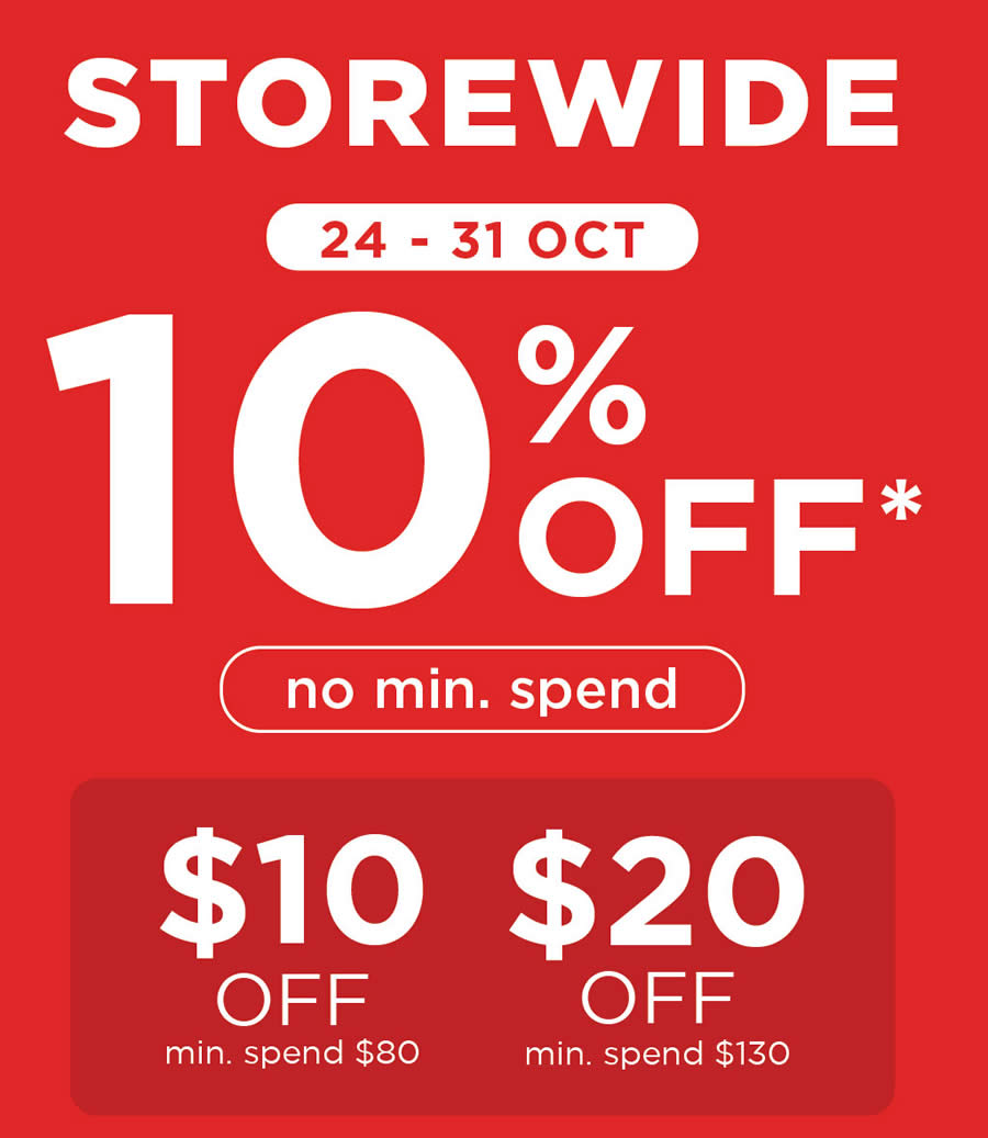• 10% OFF storewide with no min. spend – easy savings on almost everything in-store.