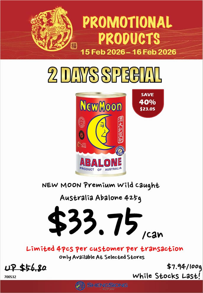 - NEW MOON Premium Wild Caught Australia Abalone 425g – $33.75 per can (Usual Price: $56.80, Save $23.05 / 40% off, Limited 4 pcs per customer per transaction, Only available at selected stores)