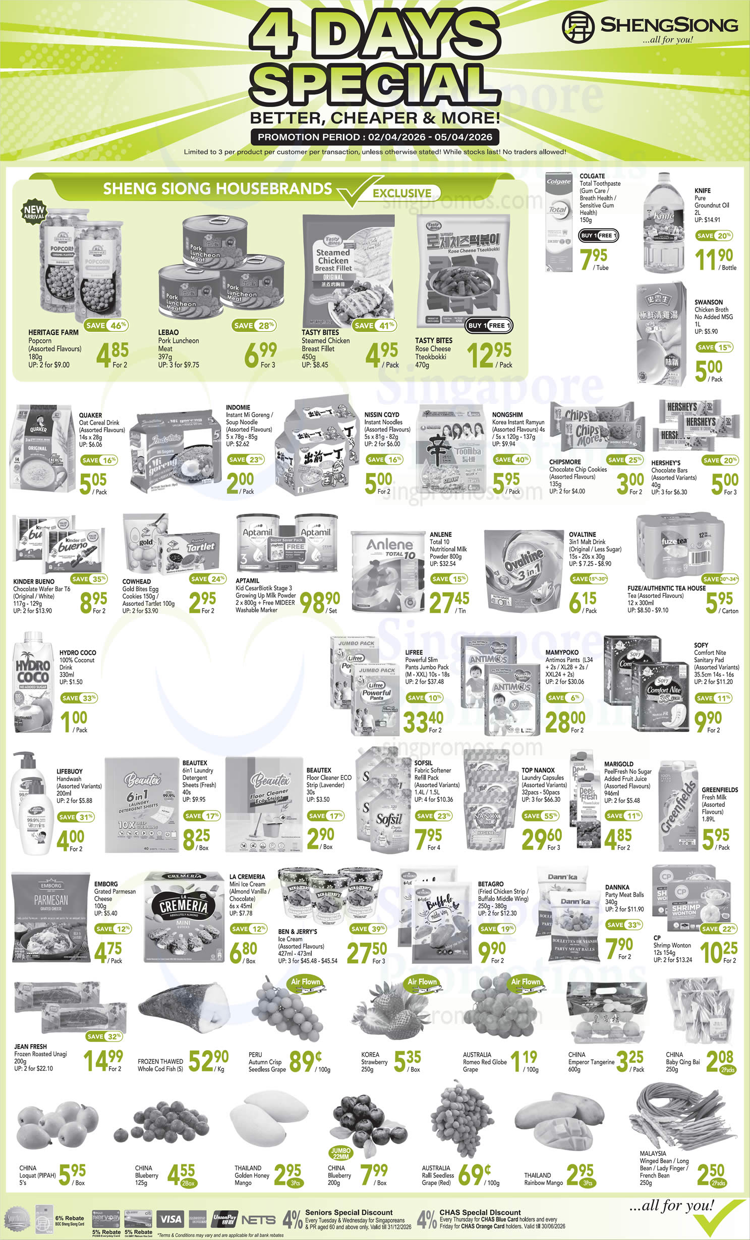 Extra savings to note: Sheng Siong has also extended its 4% Senior Citizen discount every Tuesday and Wednesday till 31 Dec 2026. In addition, CHAS Blue Card holders enjoy 4% off every Thursday and CHAS Orange Card holders enjoy 4% off every Friday, both valid till 30 Jun 2026. Terms and eligibility apply.