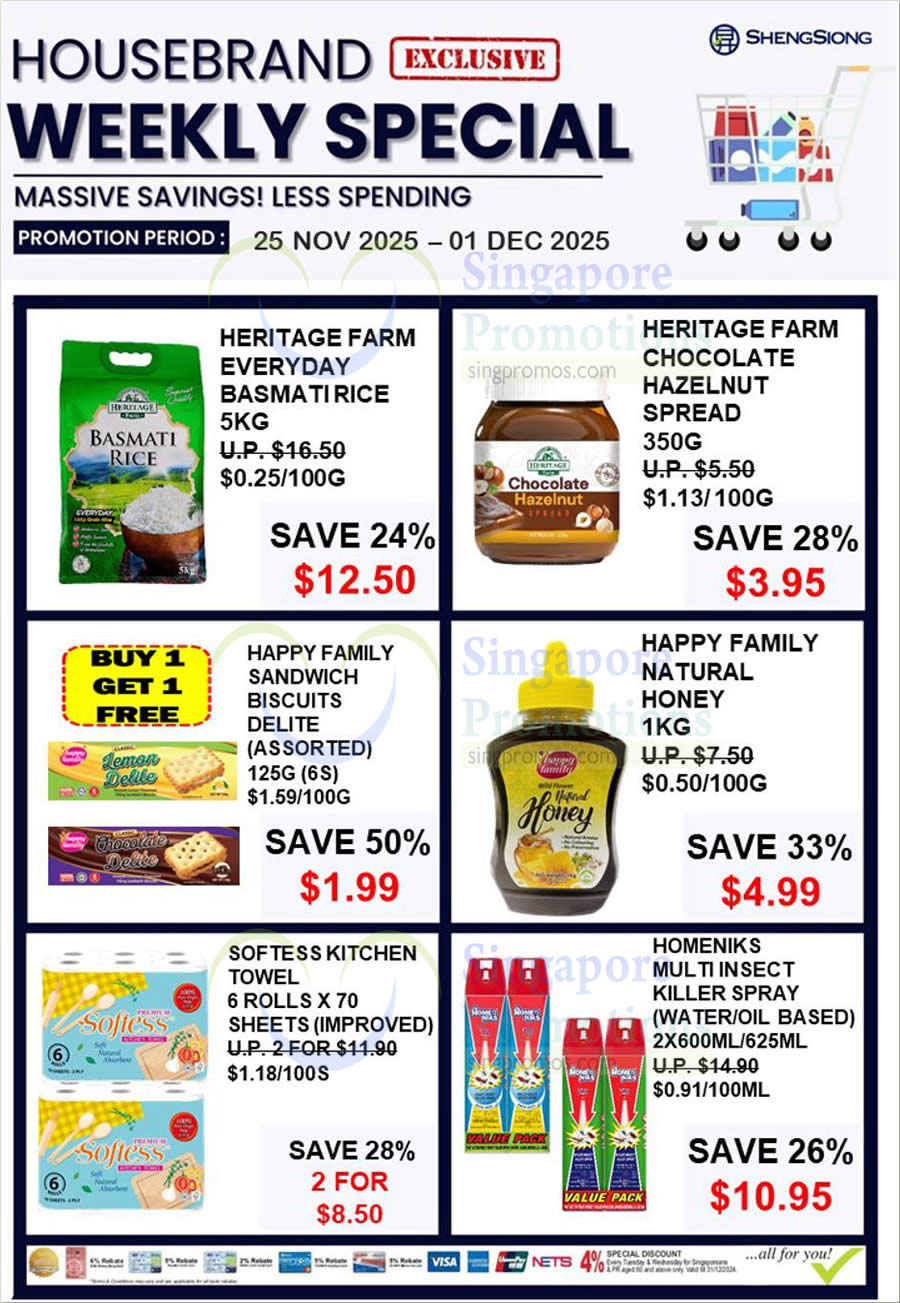 Beyond the frozen aisle, Sheng Siong is also running housebrand-only deals on daily essentials under Heritage Farm, Happy Family, Softess and Homeniks. All offers below share the same promotion period of 25 NOV 2025 – 01 DEC 2025: