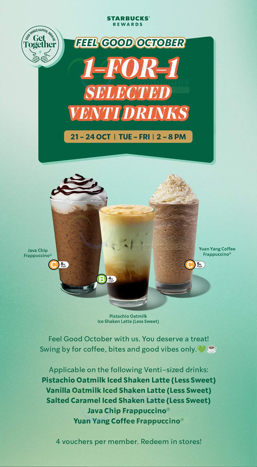 Starbucks Singapore is bringing back its popular Feel Good October promo with a 1-for-1 deal on selected Venti-sized beverages – exclusively for Starbucks® Rewards members from 21 – 24 Oct 2025 (Tue – Fri), 2 pm to 8 pm.