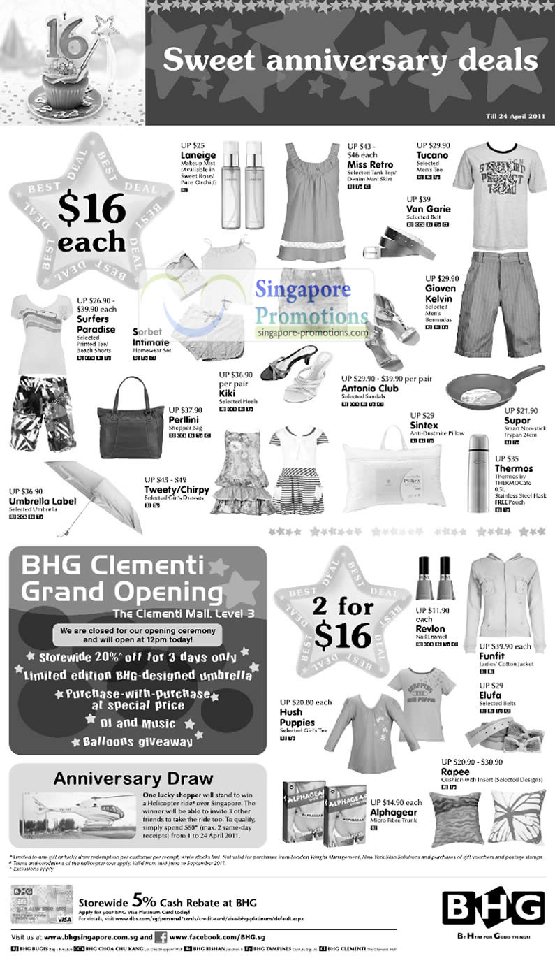 BHG Anniversary Sale 1 - 24 Apr 2011 15 Apr Laneige, Miss Retro, Tucano, Antonia Club, Sintex, Supor, Surfers Paradise, Rapee, Hush Puppies
