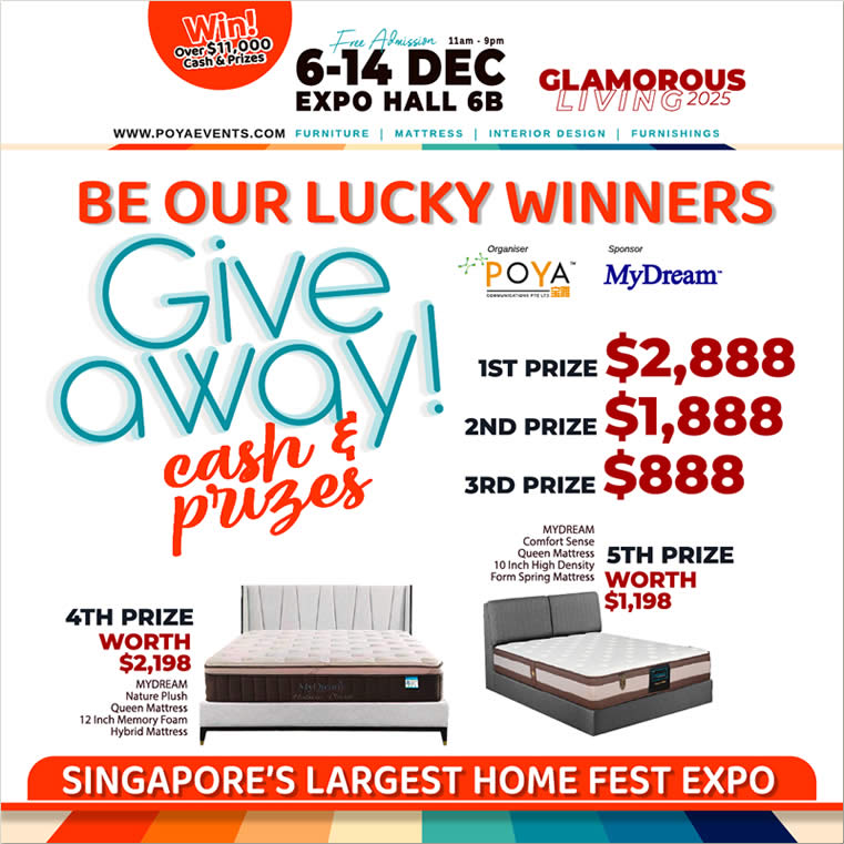 Stand a chance to win luxurious home pieces, premium mattresses, and grand cash prizes in the lucky draw.