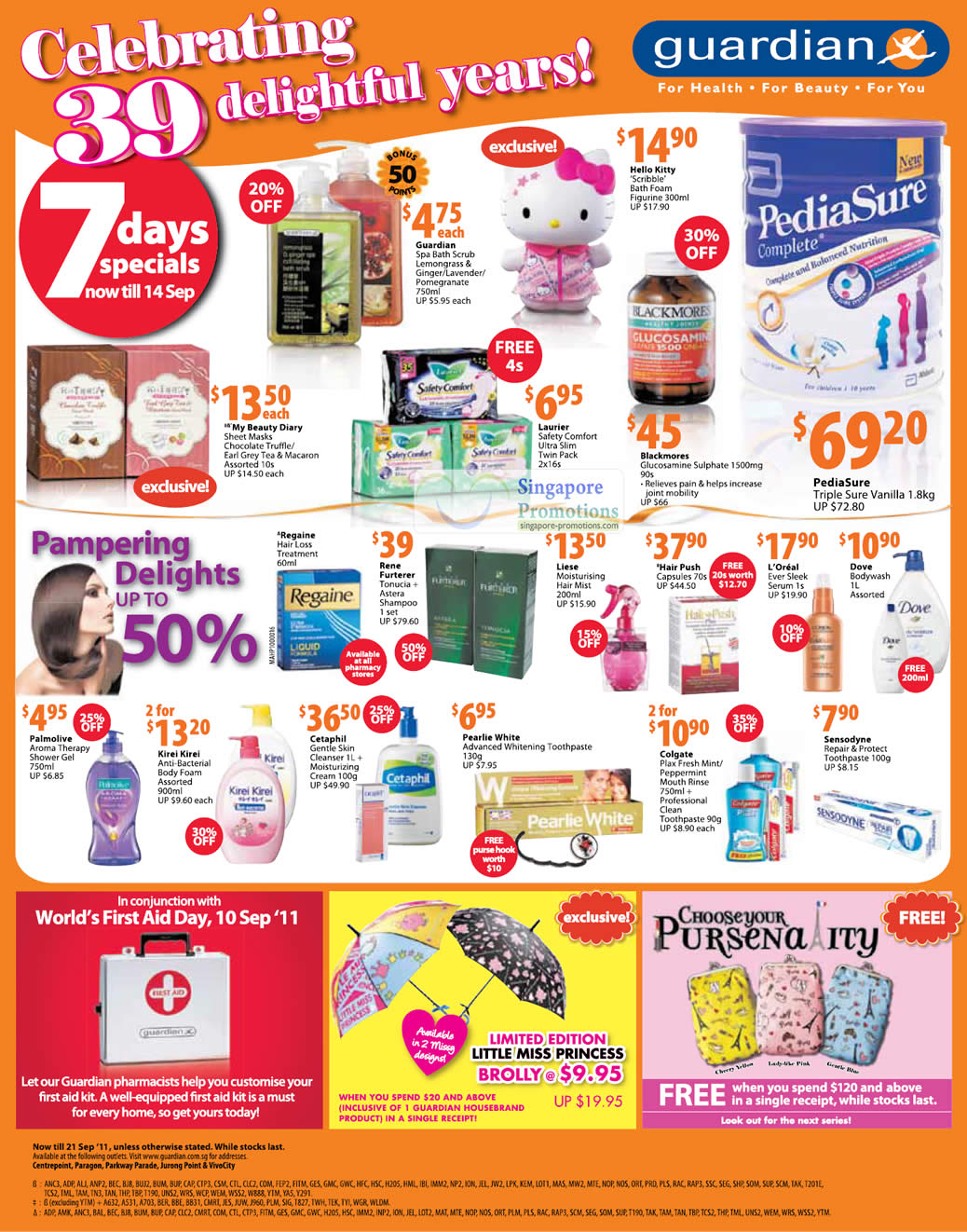 Guardian Health, Beauty & Personal Care Special Offers 8 - 14 Sep 2011 Spa Bath Scrub, Hello Kitty Scribble Bath Foam, My Beauty Diary Sheet Mask, Laurier Safety Comfort, Blackmores Glucosamine Sulphate
