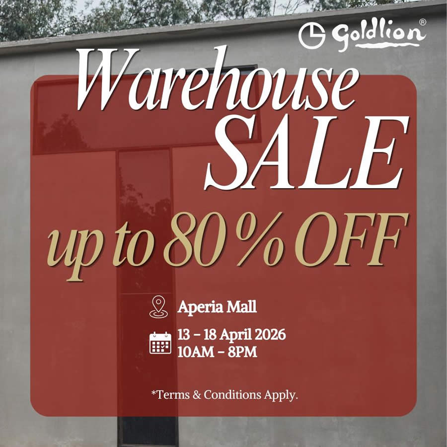 The GOLDLION Warehouse Sale is taking place at Aperia Mall, with advertised discounts of up to 80% OFF during the event period.