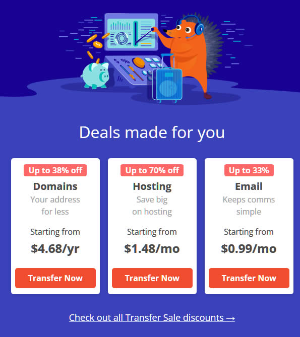 - Up to 38% off domain transfers – Get your web address for as low as US$4.68/year.